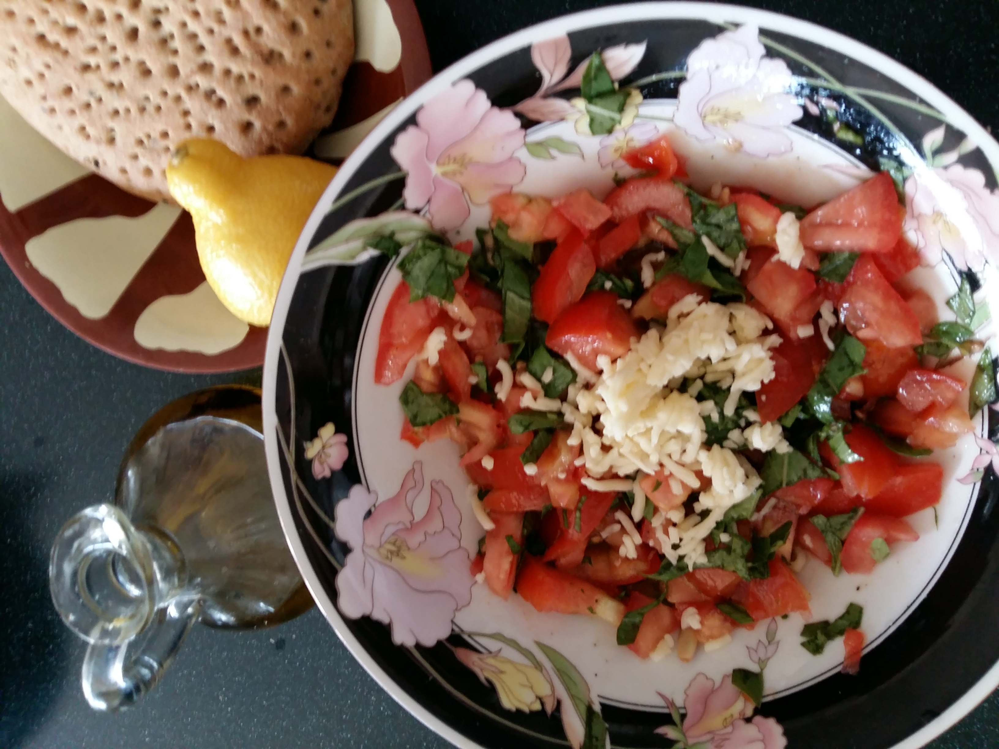 Mix the basil and tomatoes, add olive oil and lemon. Add black pepper and salt. Garnish with cheese and pine nuts.