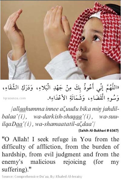 /Allaahumma innee ?abduk (a) wa-bnu ?bdik (a), naaSiyaatee bi-yadik (a), maaDi? fiyya ?ukmuk (a), ?adlu? fiyya qaDaa-uk, as’aluka bikullismin huwalak (a), sammayta bihi nafsak (a), aw ?allamtahu a?adam-minkhalaqik (a), aw-anzaltahu fee kitaabik (a), aw-ista’thart (a), bihi fee ?ilmil-ghaybi ?i?dak (a), a?taj?al-alquraana rabee?a qalbee, wa nuura SaDree, wa-jilaa’a ?uznee, wa ?ahaaba hammee/