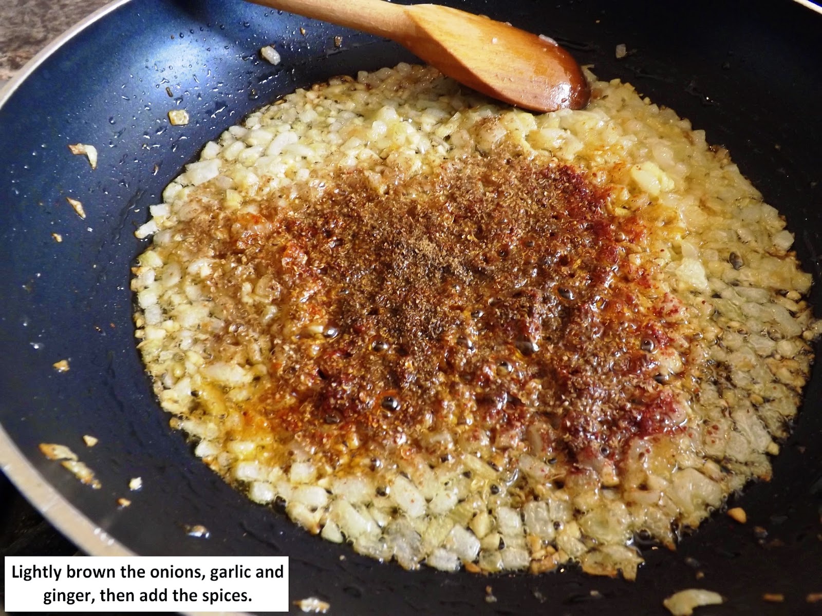 Gently bring the olive oil up to temperature, ensuring that it does not start smoking. Add the onions, garlic and ginger. Fry them until they turn lightly golden.