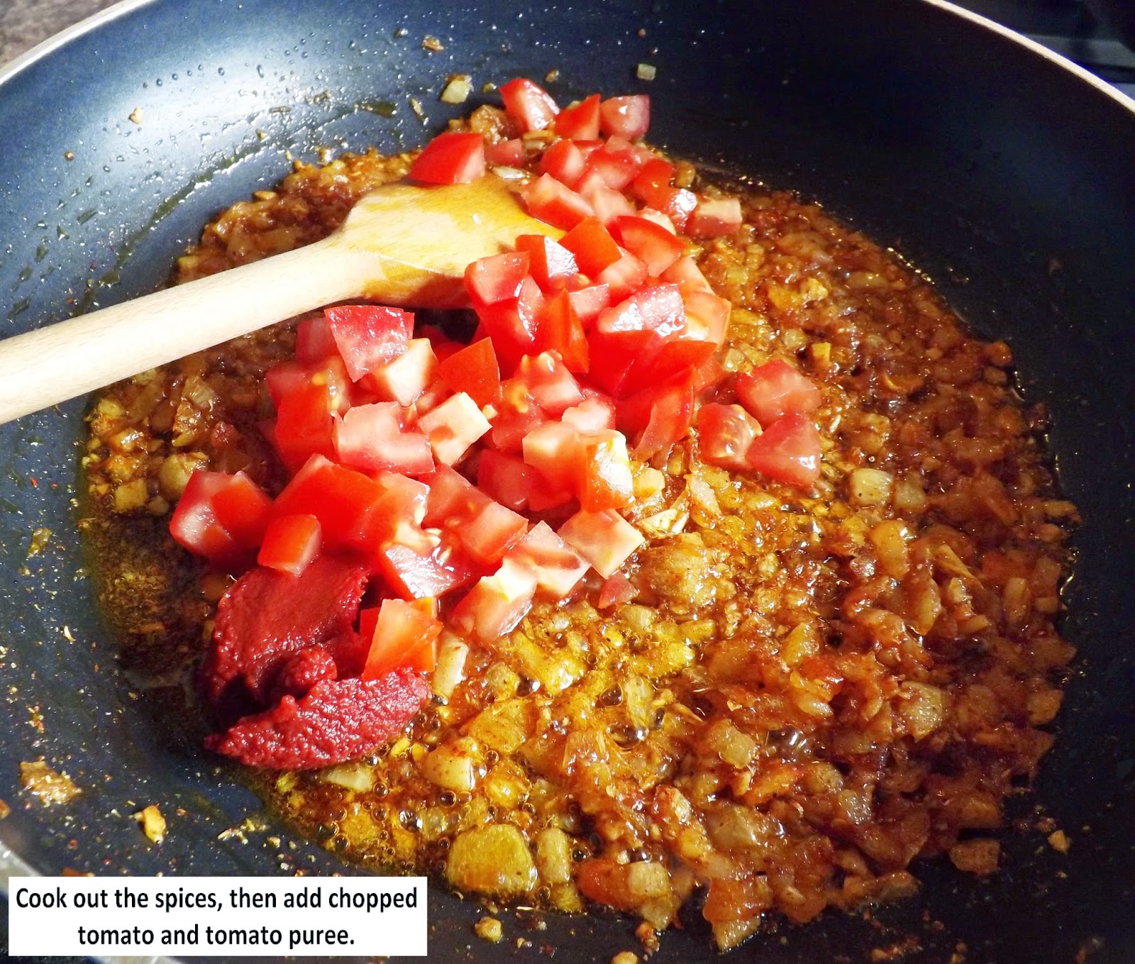 Then add the tomato puree and chopped tomato, along with salt and pepper to your taste and a little bit of water. Cook the mixture until the tomatoes have broken down to a paste and the oil starts to separate from the mixture.