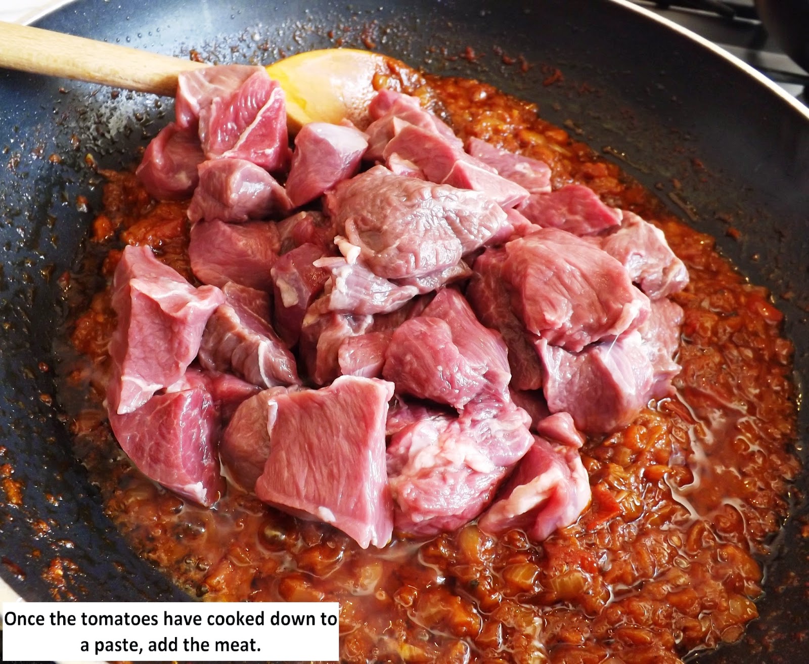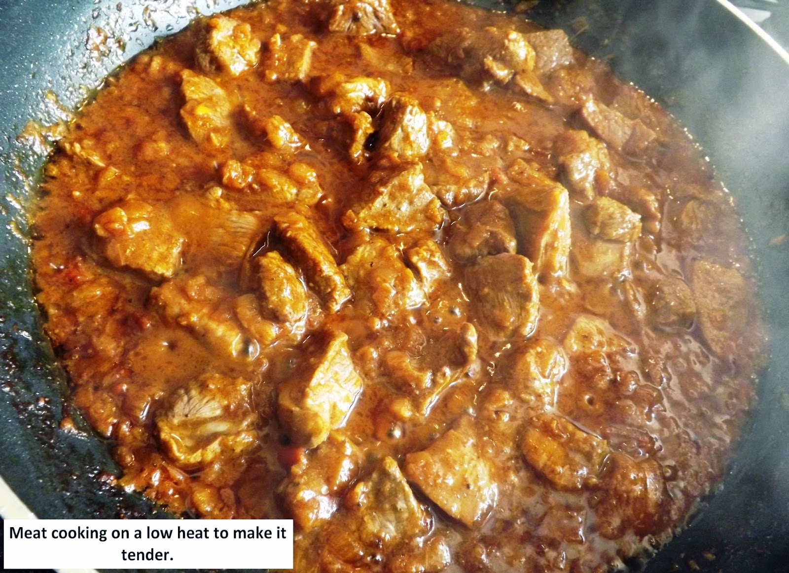 Then add the boiling water and bring to a boil. Once the mixture is boiling, turn down the heat to low and cover the pan with a lid and cook the meat for 1 and 1/2 hours or until it is tender. Or you can use a pressure cooker.