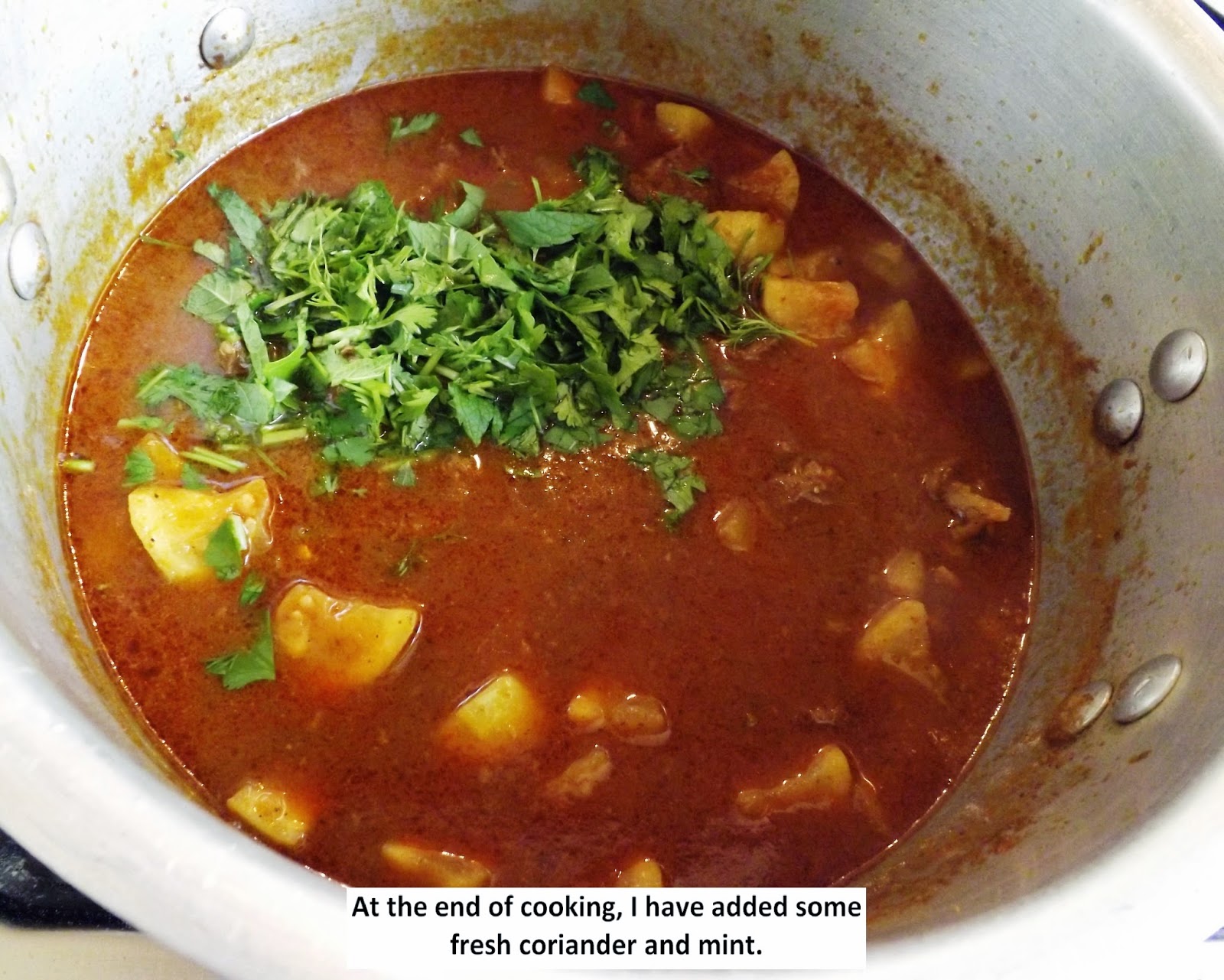 Check the seasoning and once the stew is cooked, you can turn off the heat and garnish with chopped coriander and mint.