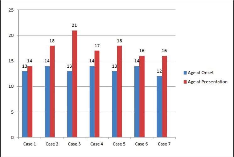 Furthermore, in this case series, the age of onset vis-a-vis age of presentation to the medical services has been long, the average duration in years is 3.8 [Figure 1]. Such late presentation can be one of the reasons that explain the poor response to treatment and poor psychotherapeutic alliance. There can be few explanations for such late presentation, firstly, lack of awareness and understanding of eating disorders among the families of the patients. Secondly, the explanatory model, and attitude toward mental illness that the family possesses, as it is not uncommon for Middle-Eastern families to seek help of folk healers for mental disorders, which can lead to delay in seeking professional help