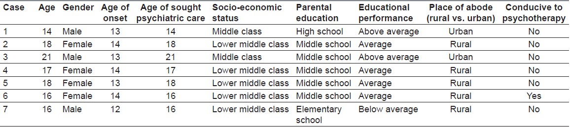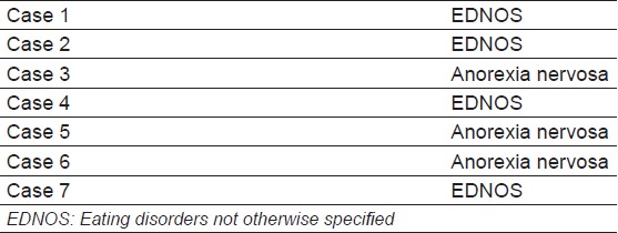 High socio-economic status (SES) has long been regarded as a risk factor for eating disorders, and those that belong to high SES are more likely to watch calories, diet, and have a lower body weight. [14] And it has been hypothesized that non-Western societies, as they become more affluent, develop a higher risk of eating disorder. For example, a study by Lee and Lee supports this association, [15] the study compared eating pathology with three socio-economic zones in China, and it found that body dissatisfaction and eating disturbance was greater among schoolgirls of the more affluent zone. Similarly, there were no reports of anorexia nervosa in the ethnic minority groups in USA back when they were not among the affluent groups of the society. [16] However, in recent times, African-American women from high SES have reported similar levels of body dissatisfaction when compared to North-European American women. [17] In the cases discussed in this study, none of the patients were of affluent background two were part of a middle-working-class family, whereas five were from lower-middle class working families [Table 1]. Therefore, it is argued that increased wealth is not proportional with increased prevalence of eating disorders, and eating pathology is no longer restricted to high SES. [18],[19]