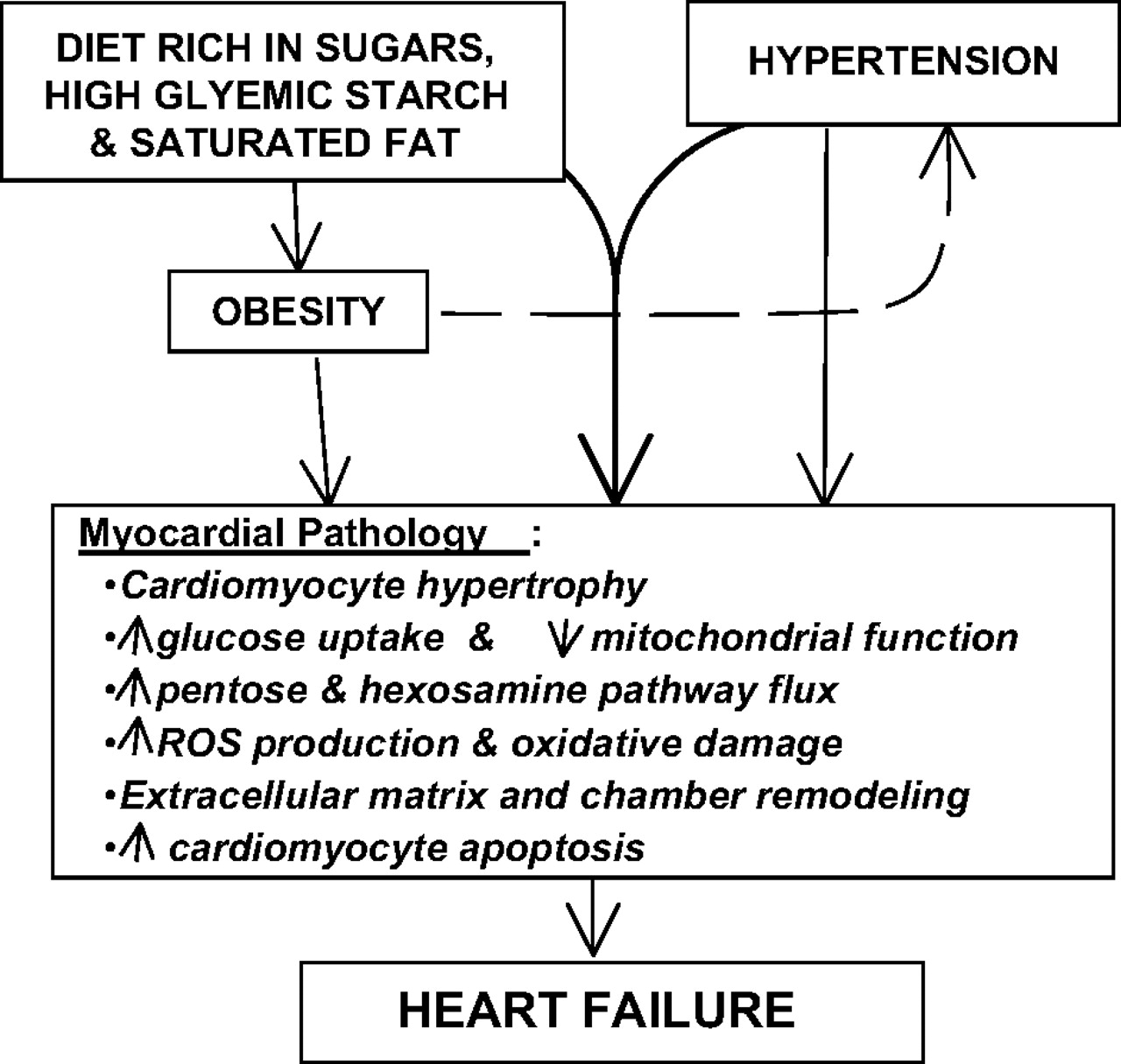 Though there is little information about the effects of carbohydrates composition and dietary fats on development of heart failure directly. But cardiac failure co-related with hypertension and obesity. In the end of last century, it was observed that consumption of saturated fats and carbohydrates (highly processed), such as white potatoes, sugar, white flour increased the risk of obesity in western societies.