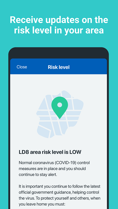 - Alert: lets you know the level of coronavirus risk in your postcode district.