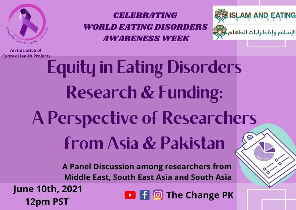 World Eating Disorders Day is fast approaching, June 2, 2021. We’ve collaborated with an organization in Pakistan for this day. We have joined hands with Dr Madeeha from Hamdard University Islamabad and on June, 2 we will be holding a panel discussion to discuss equity for eating disorders and research gaps in literature in Pakistan and Asia.