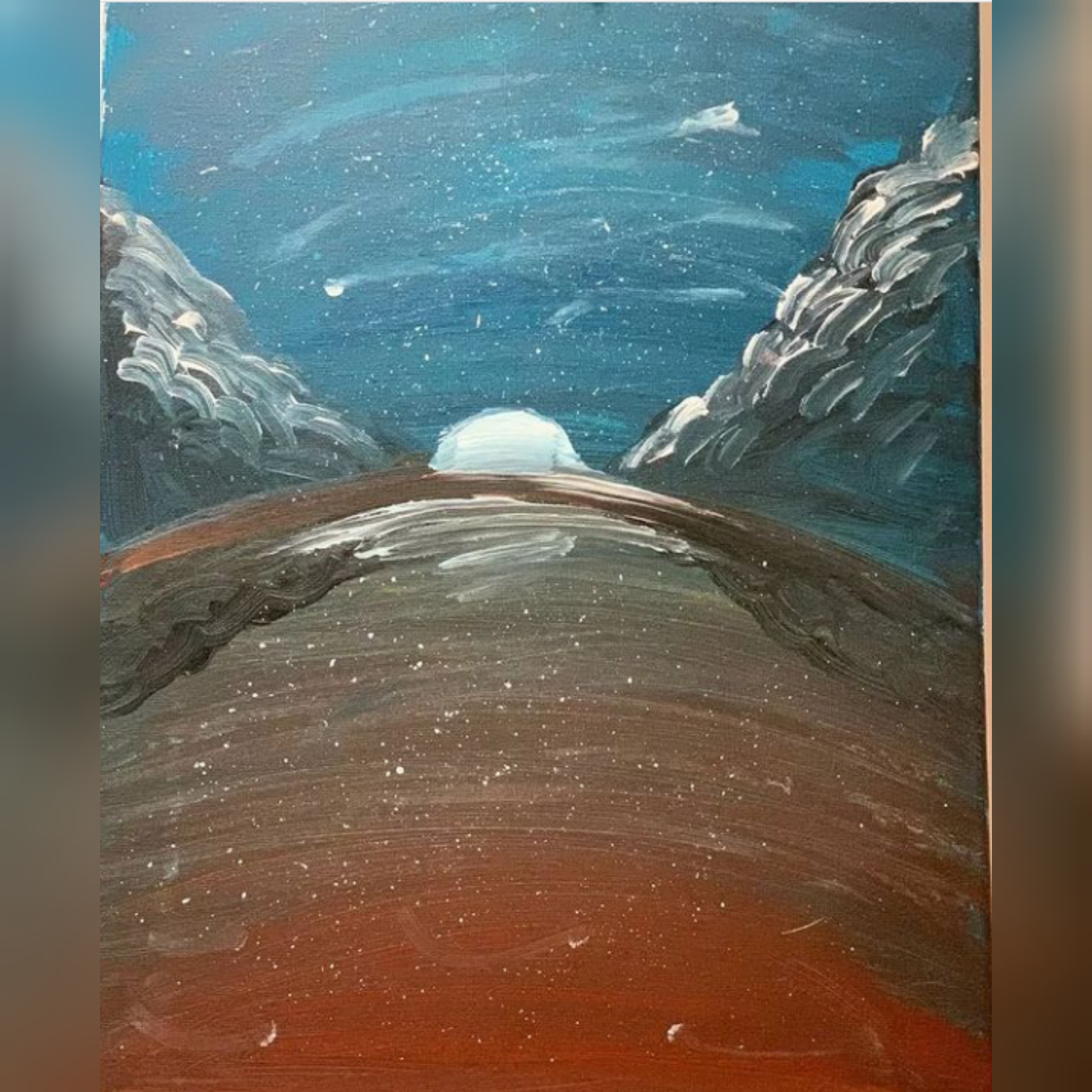 Uncomfortable feelings, yet comfortable.”It’s a drawing represents a feeling of emotions are terrified but in the same time these emotions turn into a comfortable ones.Red represents anxiety, fears and angerBut blue, represents trust, courage and calmness,And white, represents the light and the way out..”healing”
