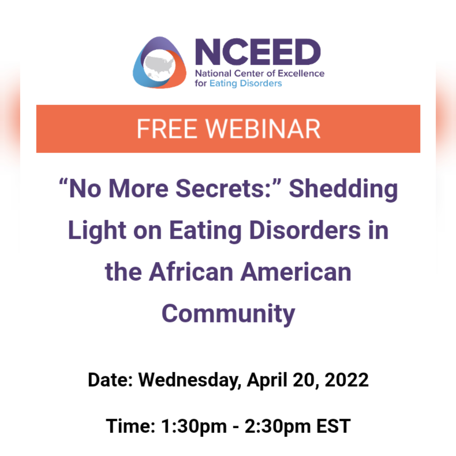 Please find details for webinar, “No More Secrets”: Shedding Light on Eating Disorders in the African American Community. We hope you’ll register for this webinar as it will be shedding light on one of the most neglected Communities suffering from Eating Disorders. We thank NCEED for organizing this free webinar.