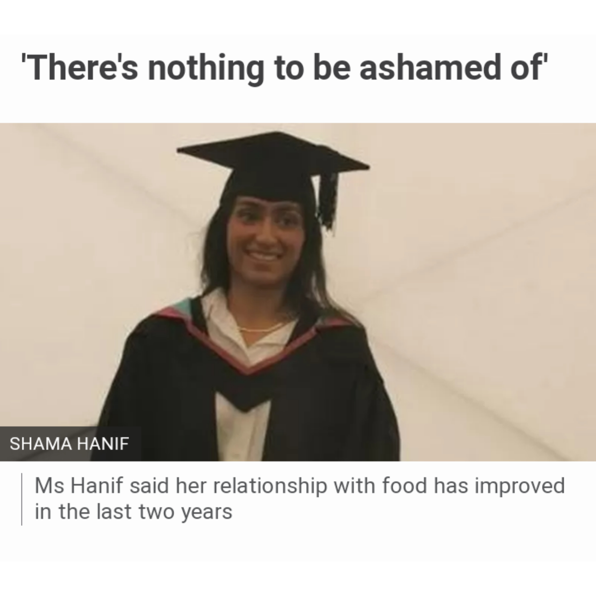 Shama Hanif is a 26-year-old Muslim woman who works as a school counsellor in Peterborough. She was diagnosed with anorexia in her mid teens. Here, in her own words, Ms Hanif tells of her struggle with the illness and how she has cast off the shame she once felt about her condition.